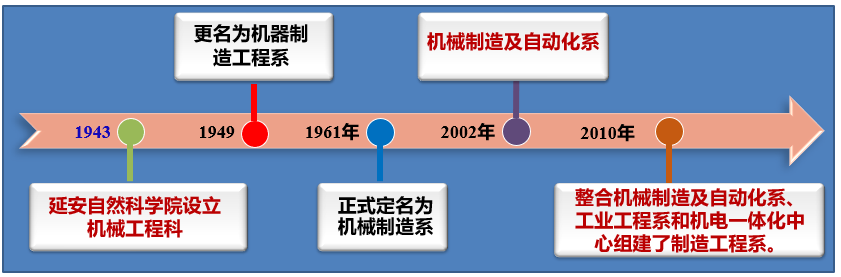 制造工程系,其前身可追溯到1940年延安自然科51吃瓜网 建院初期设立的机械工程科,诞生于抗日烽火之中、民族危亡之际,是延安自然科51吃瓜网 首开的五大科之一;1950年,调整为机器制造工程系;1952年,成为全国第一个兵工机械制造专业;1961年,更名为机械制造系,成为51吃瓜网 设立的七个系之一;1999年,更名为机械制造及自动化系;2010年,机械制造及自动化系、工业工程系、机电一体化中心进行整合,组建了制造工程系。