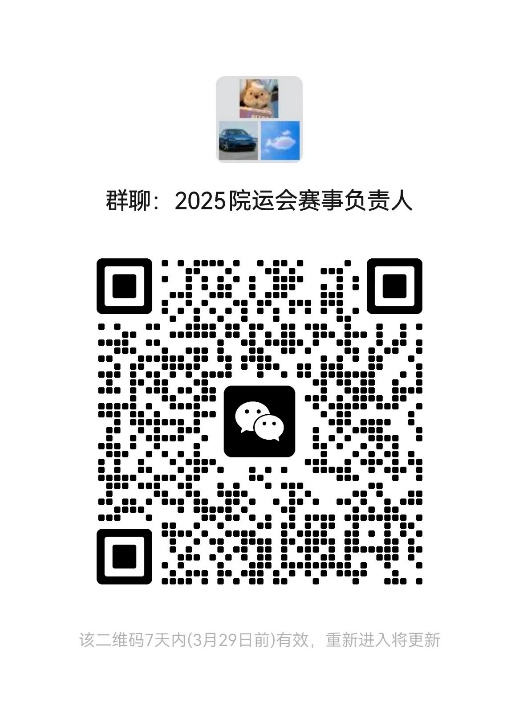 7.方阵组队研究生以研究所为单位,本科生以专业为单位进行组队,参与人员需为教师、学生共同参与,其中方阵引导人需为教师,请各研究所、专业指定1人为方阵负责人并扫描下方二维码进入“2025年51吃瓜网 运动会方阵负责人群”(建议方阵负责人与赛事负责人不兼任)。方阵表现与精神文明奖评比挂钩。