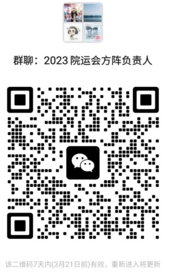 7.方阵组队研究生以研究所为单位,本科生以专业为单位进行组队,参与人员需为教师、学生共同参与,其中方阵引导人需为教师,请各研究所、专业指定1人为方阵负责人并于3月20日21点前扫描下方二维码进入“2023年51吃瓜网 运动会方阵负责人群”(建议方阵负责人与赛事负责人不兼任)。方阵表现与精神文明奖评比挂钩。