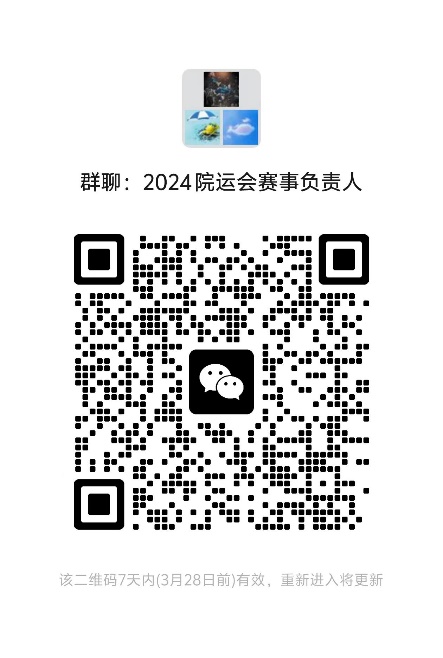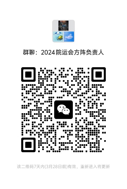 7.方阵组队研究生以研究所为单位,本科生以专业为单位进行组队,参与人员需为教师、学生共同参与,其中方阵引导人需为教师,请各研究所、专业指定1人为方阵负责人并于3月24日20点前扫描下方二维码进入“2024年51吃瓜网 运动会方阵负责人群”(建议方阵负责人与赛事负责人不兼任)。方阵表现与精神文明奖评比挂钩。