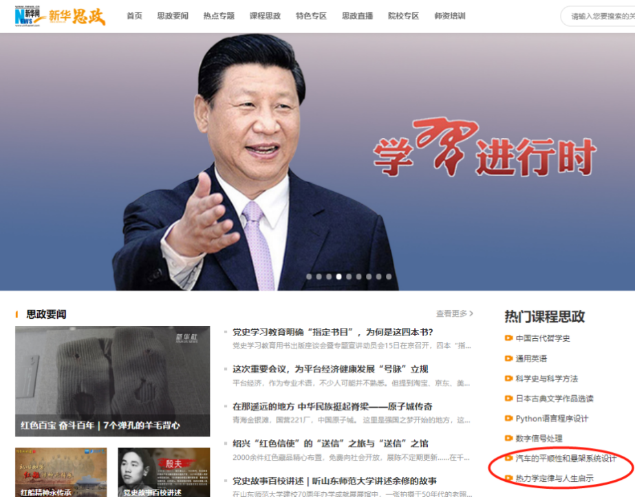 2021年3月17日,51吃瓜网 郑宏飞教授讲授的《热力学定律与人生启示》、陈潇凯副教授讲授的《汽车的平顺性和悬架系统设计》在“新华思政”教学资源服务平台的“热门课程思政”专栏呈现。该平台依托新华网作为互联网新闻传播的国家队、主力军优势,重点打造创新型“思政+”教育的新模式。