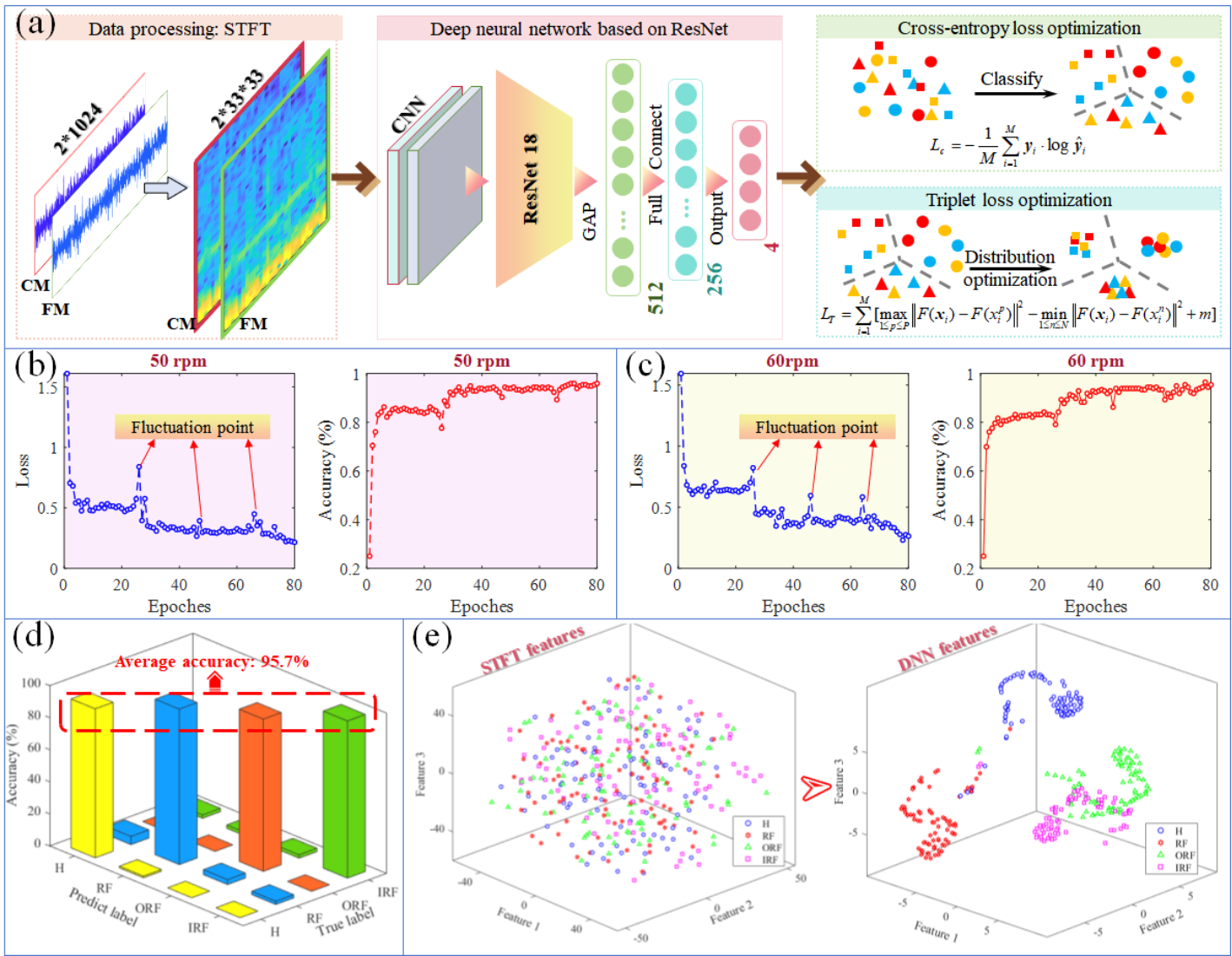 本项研究成果创新性地利用双列圆锥滚子轴承的可分离对称结构,在主轴轴承外圈上安装双面电极板并用定位销固定,同时在两侧保持架端面附着介电环,通过保持架旋转运动带动介电环摩擦电极板产生摩擦电信号。研究结果表明,所提自供能监测诊断方案具有高灵敏度、稳定性和可靠性,在材料选择和设计间隙方面具有良好的鲁棒性,能够在无外部电源下长时间稳定运行。在风力发电机测试台上验证了对称单电极式摩擦电智能轴承SST-DTRB在变转速工况条件下的有效自供能监测和健康状态自感知能力。基于时频变换和深度残差神经网络,在多工况条件下实现了高达95.6%的风力发电机主轴轴承故障诊断准确率。所提对称单电极式摩擦电智能轴承SST-DTRB为风力发电机提供了原位自供能感知能力,为智能感知系统的发展提供了新见解。