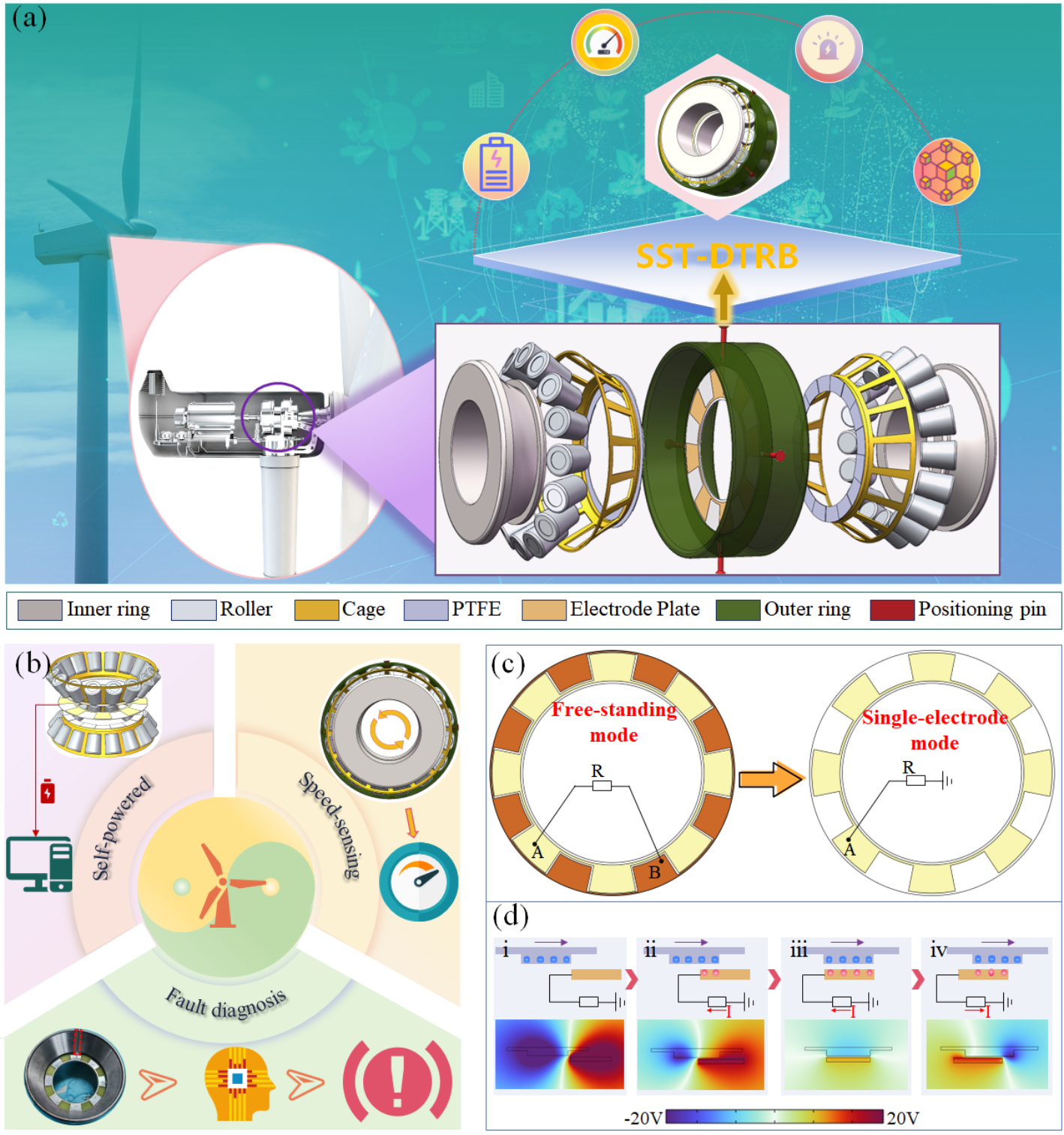图2. 对称单电极式摩擦电智能轴承SST-DTRB在风力发电机自供能智能状态感知中的应用