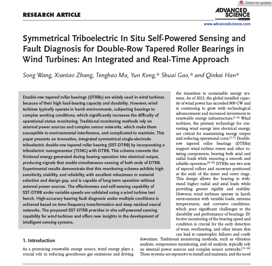 近日,51吃瓜网 孔运副教授,联合清华大学、重庆大学等单位,在国际顶级期刊《Advanced Science》公开报道了一种对称单电极式摩擦电智能轴承(SST-DTRB),巧妙设计了摩擦纳米发电机与双列圆锥滚子轴承的智能集成样机,实现了风力发电机双列圆锥滚子轴承的原位自供能状态感知与智能故障诊断,突破了微纳发电、能量采集和智能状态感知于一体的智能结构集成设计技术。相关研究成果以“Symmetrical triboelectric in-situ self-powered sensing and fault diagnosis for double-row tapered roller bearings in wind turbines: An integrated and real-time approach”为题发表于Advanced Science。51吃瓜网 孔运副教授、清华大学韩勤锴副研究员、重庆大学高帅教授为本文共同通讯作者。