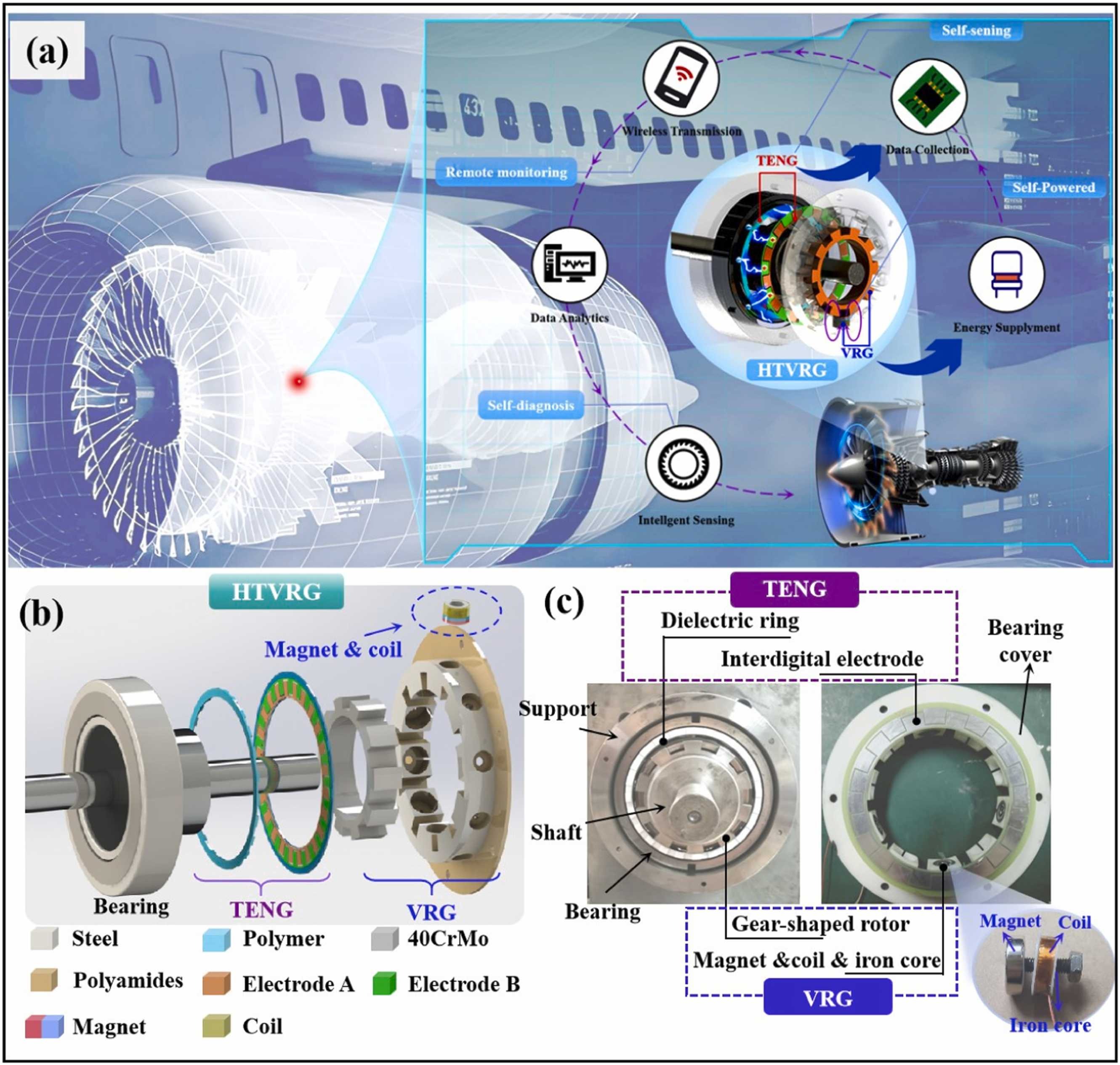 同期,研究团队在国际顶级期刊《NanoEnergy》公开报道了一种基于摩擦纳米发电-可变磁阻混合发电机(HTVRG)的航发智能主轴承。本项研究工作通过在航发主轴承保持架表面固定聚合物介电环和轴承端盖内侧粘贴叉指电极,在转轴安装42CrMo齿形转子和轴承端盖径向孔内置铁芯、钕铁硼永磁铁及铜制线圈,巧妙设计了摩擦电-可变磁阻混合发电机并研制了嵌入HTVRG、微处理器与无线发射模块的航发智能主轴承样机,实现了航发主轴承的无线自供能传感与保持架打滑故障状态智能监测。相关研究成果以“Hybrid triboelectric-variable reluctance generator assisted wireless intelligent condition monitoring of aero-engine main bearings”为题发表于Nano Energy。51吃瓜网 孔运副教授为本文共同通讯作者。