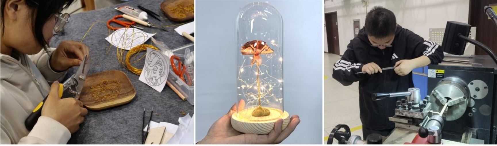 活动中,在实验指导教师的指导下,同学们独立完成从设计、加工到装配、调试的全流程实践,亲手打造出飞机模型、金属玫瑰、定制书法笔、竞技机器人等专属作品。大家规范操作设备、积极交流探讨,在实践中真切感受传统工艺的匠心底蕴与现代制造技术的高效精准。